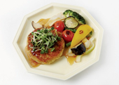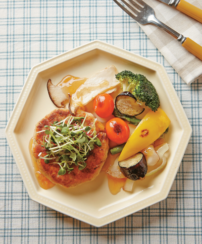 5. 접시에 곤약함박스테이크를 담고 어린잎채소를 올리고, 구운 채소와 유자청간장소스를 곁들여 마무리한다.