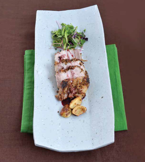 7. 구운 삼겹살 스테이크에 마늘과 잎채소를 곁들이고 레드와인 소스 를 뿌린다.