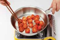 5. 방울토마토는 꼭지를 떼고 윗면 에 십자모양의 칼집을 내어 뜨거 운 물에 살짝 데쳐 껍질을 벗긴 후 반으로 자른 다음, 후추와 올리브 유를 넣어 10분 정도 재워 두었다 가 프라이팬에 돌려가며 굽는다.b
