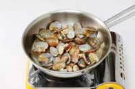 4. 달궈진 팬에 올리브유를 두르고 센 불에 마늘과 양파를 볶고, 바 지락을 넣은 다음 청주, 후추를 넣 어 잡내를 없애고 바지락이 벌어 질 때까지 익힌다.a
