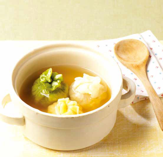 8. 육수500g을 끓이다가 만두와 마늘을 넣고 끓여 그릇에 담아 지단과, 홍 고추를 올리고 김 가루를 뿌려 완성한다.
