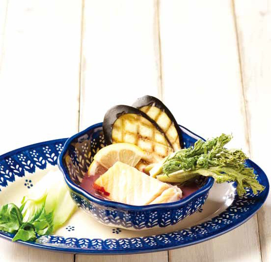 5. 접시에 연어, 가지, 레몬, 두릅, 청경채를 담고 드레싱을 뿌려 완성한다.