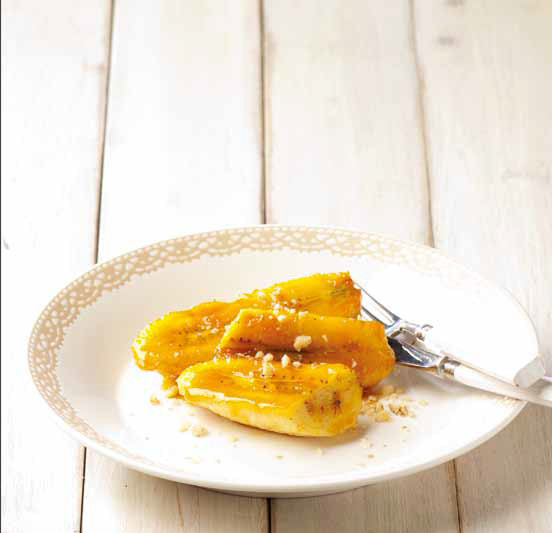 4. 완성된 바나나를 접시에 담고, 다진 호두를 뿌린다. (기호에 따라 초코시럽, 캬라멜시럽 등을 뿌려 먹는다.)