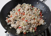 4. 밥과 저염된장, 후춧가루를 넣고 볶다가 들기름을 넣어 한 번 더 볶는다.