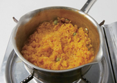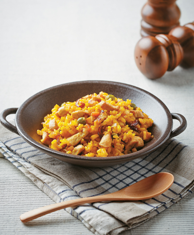 1. 쌀은 30분 정도 불린 뒤 동량의 물에 강황가루를 풀어 완두콩과 함께 넣어 밥을 짓는다.