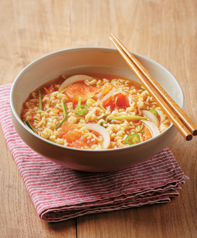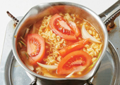 4. 육수에 라면스프와 라면을 넣고 살짝 익힌 뒤 양파, 애호박, 다진 토마토를 넣고 끓인다.