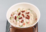 5. 찹쌀과 보리쌀을 넣어 만들어진 채소국물에 끓여주다 생크림과 우유를 넣어 죽 형태로 만든다.