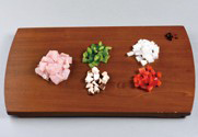 3. 불린 표고버섯, 청피망, 홍피망, 양파, 오리 가슴살은 작은 정사각형으로 잘라주고 청양 고추는 다져준다.