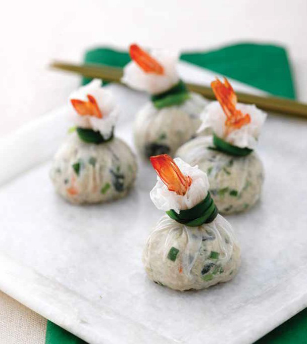 9. 이때 새우 꼬리부분을 위 로 올라오게 올린 후 라이 스페이퍼로 감싸고 부추 로 묶는다.d