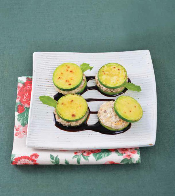 6. 애호박을 깔고 두부패티를 올리고, 그 위에 애호박을 얹은 다음 발사 믹 소스와 함께 곁들인다.
