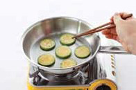 5. 애호박을 1cm 두께로 자르고 달군 프라이팬에 올리브유를 두르고 구 워 준비한다.c