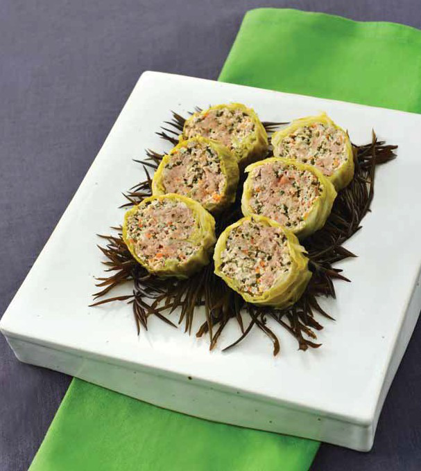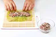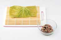 8. 양배추 소를 양배추잎 위에 지름 3cm로 올리고 김발과 양배추를 함께 잡고 김밥 말듯이 단단히 조 이며 말아준다.c