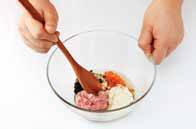 4. 그릇에 다진 돼지고기, 두부, 당근, 파, 우뭇가사리, 톳, 달걀흰자를 넣 고 골고루 섞어 치댄다.a
