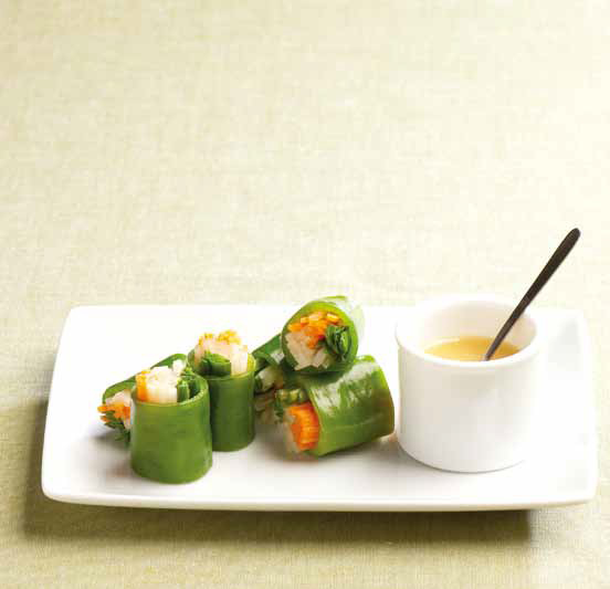 6. 당근, 무, 양파, 부추를 겨자냉채소스와 버무려 오이고추의 속을 채워 완성 한다.