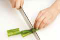 5. 오이 고추는 길게 칼집을 넣어 씨를 제거한 다음 4cm로 썬다.c