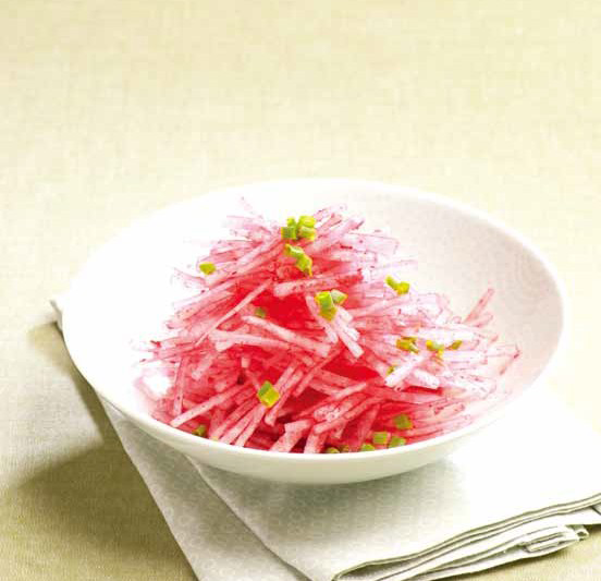 3. 비트 물에 채 썬 무를 넣어 색을 들인다.