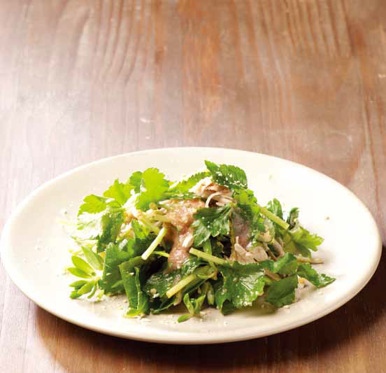 7. 참나물, 돌나물과 삶은 닭 가슴살을 3과 버무려주고 접시에 담는다.