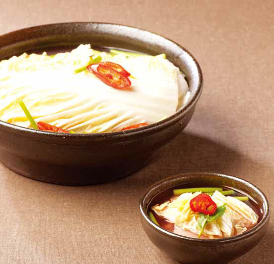 6. 배추에 김치 국물을 붓고 그 위에 썰어둔 홍고추, 미나리, 생강을 올려 완 성한다.