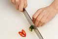 5. 홍고추는 어슷하게 썰고, 미나리는 3cm 길이로 썰고 생강은 채 썬다.c