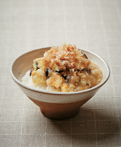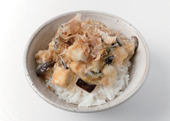 6. 밥을 그릇에 담고 덮밥소스를 곁들인 후 두부, 가지, 가다랑어포를 얹어 마무리한다.