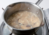 1. 찬물에 다시마를 넣고 끓여 건져 내고 불을 끈 후 가다랑어포를 넣어 우려 육수를 만든다.