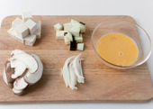 2. 두부, 가지는 깍둑 썰고, 표고버섯, 양파는 채 썰고, 달걀은 곱게 푼다.