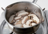 4. 육수(1컵)에 청주, 설탕, 간장을 넣고 표고버섯, 양파를 넣고 조려 덮밥 소스를 만든다.