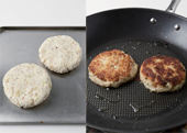 4. 볶은 채소, 두부, 고구마, 다진 견과류, 찹쌀가루를 섞은 뒤 반죽해 둥글 납작하게 모양을 빚고, 식용유(15g)를 두른 팬에서 앞뒤로 노릇하게 굽는다.