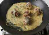 6. 소스를 팬에 넣고 끓이다가 꽁치 꼬치를 넣고 졸인 뒤 그릇에 무순, 새싹과 함께 담아 마무리한다.