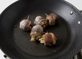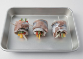 4. 수분을 제거한 꽁치에 밀가루를 묻혀 깻잎→마늘종→양파→ 파프리카 순으로 올려 돌돌 말아 꼬치로 꽂아 고정한다.