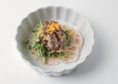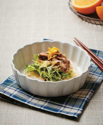 6. 그릇에 연근초절임, 미나리, 어린잎채소, 차돌박이 순서로 담은 뒤 오렌지 껍질과 오렌지소스를 얹어 마무리한다.