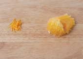 3. 오렌지는 껍질은 얇게 벗겨 채 썰고, 과육부분은 반달 모양으로 2조각 썬다.