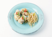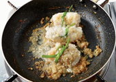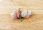 2. 새우를 다져 아귀포 안에 채워 넣은 뒤 데친 미나리로 묶는다.