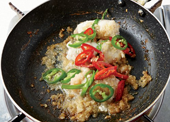 4. 아귀가 익으면 고추를 어슷 썰어 올린 뒤 살짝 더 익힌다.