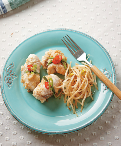 재료 아귀(150g), 새우(20g), 미나리(15g), 풋고추(5g), 붉은 고추(5g)