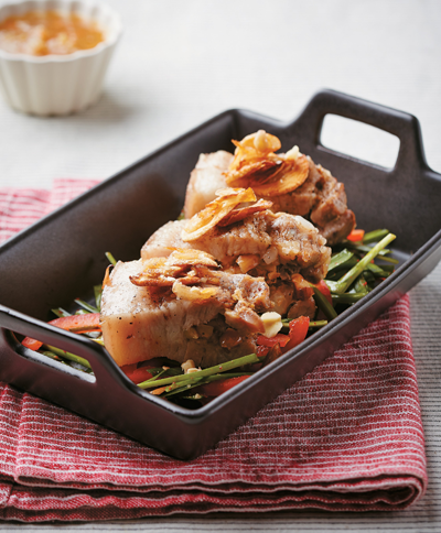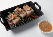 6. 통삼겹살을 먹기 좋은 크기로 썰어 부추, 파프리카 위에 놓고 튀긴 새우젓과 마늘을 올린 뒤 소스를 곁들여 마무리한다.