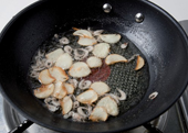 3. 물기를 뺀 새우젓과 편 썬 마늘을 기름에 튀긴다.