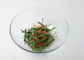 5. 파프리카는 채 썰고, 부추는 먹기 좋은 크기로 썰어 들기름과 고춧가루에 버무린다.