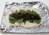 4. 쿠킹포일에 참기름을 바르고 반죽을 펼친 뒤 깻잎을 얹고 그 위에 톳을 올려 김밥 말듯이 만다.