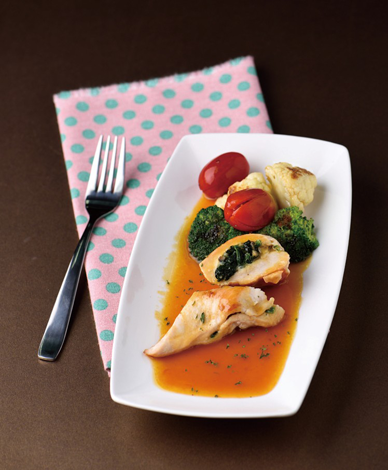 5. 닭가슴살을 포를 떠준 후 졸여준 채소를 채워준다.