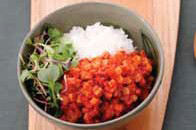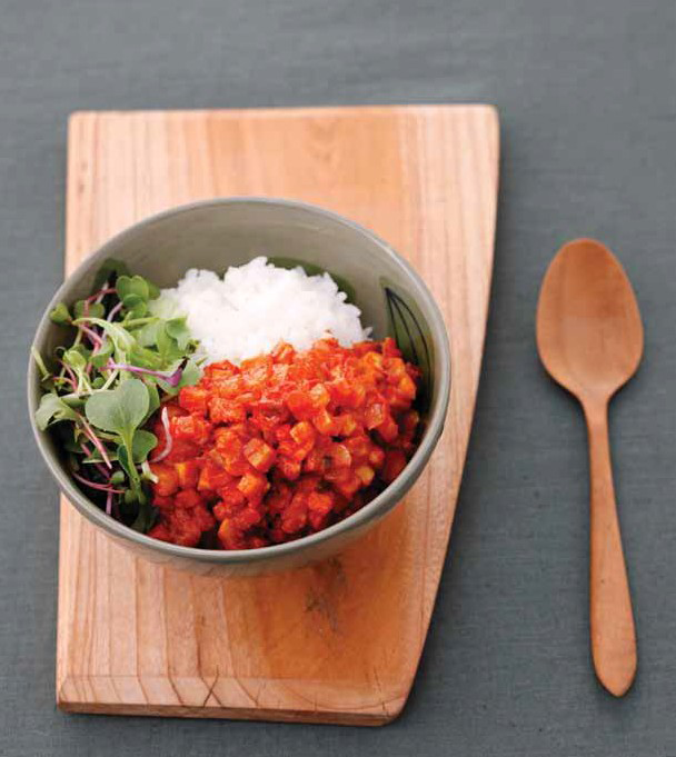 6. 그릇에 밥과 고구마 커리(5)를 담고, 어린잎 채소가 있으면 곁들인다.b