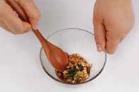 4. 호두, 아몬드는 잘게 다지고, 유부는 잘게 썰고, 쪽파는 송송 썰어 참기름, 간장과 설탕을 넣어 양념장을 만든다.b