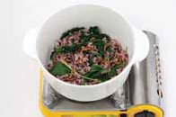 3. 깨끗하게 씻어 불린 찹쌀에 데친나물, 채 썬 당근, 대추를 넣어 자작하게 물을 부어 밥을 짓는다. 밥물은 나물에서 수분이 나오므로 밥을 지을 때 보다 적게 넣는다.a