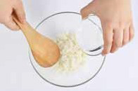 6. 뜨거운 밥에 배합초(5)를 넣어서 밥알이 으깨지지 않게 고루 저어 가면서 밥을 체온 정도로 식힌다.c