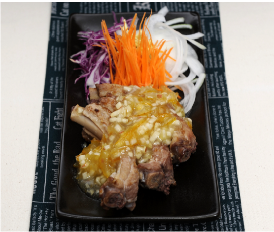 6. 마늘기름으로 삶아 놓은 등갈비를 노릇노릇 하게 굽고, 접시에 담아 물기를 빼 놓은 채소를 담고 유자소스를 올려 완성한다.