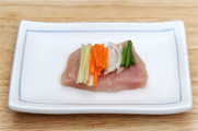5. 우유에서 닭고기를 건져 후춧가루를 살짝 뿌린 후 잡곡밥(②)과 볶아 놓은 채소(④)를 넣어 돌돌 말아 준다.