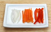 3. 파프리카는 가운데 씨를 제거하고 채를 썰고, 당근과 양파도 파프리카 길이로 채를 썰고, 애호박은 껍질 부분만 돌려 깎아 채를 썰어 준비한다.