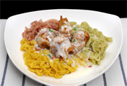6. 파스타면(④) 위에 튀긴 닭(⑤)을 올리고 냄비에 크림소스를 끓이다가 설탕을 넣고, 다시 끓으면 파프리카와 피망, 깻잎(③)을 넣고, 한 번 더 끓인 후 깐풍파스타에 올려 완성한다.