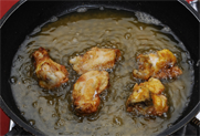 5. 숙성한 닭(②)은 녹말가루와 달걀을 섞은 반죽을 입혀 170℃의 튀김기름에 두 번 튀겨 기름을 제거한다.