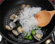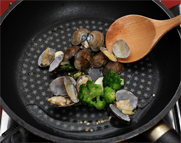 5. 볶아지는 팬에 바지락과 브로컬리를 넣고 볶는다.